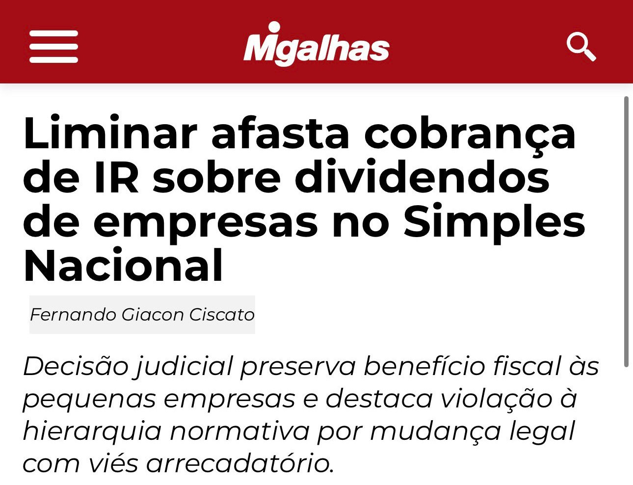 ↳ Em fevereiro de 2026, a 26ª Vara Cível Federal de São Paulo concedeu liminar para afastar a cobrança do IRPF sobre dividendos distribuídos a sócios de escritório de advocacia optante pelo Simples.